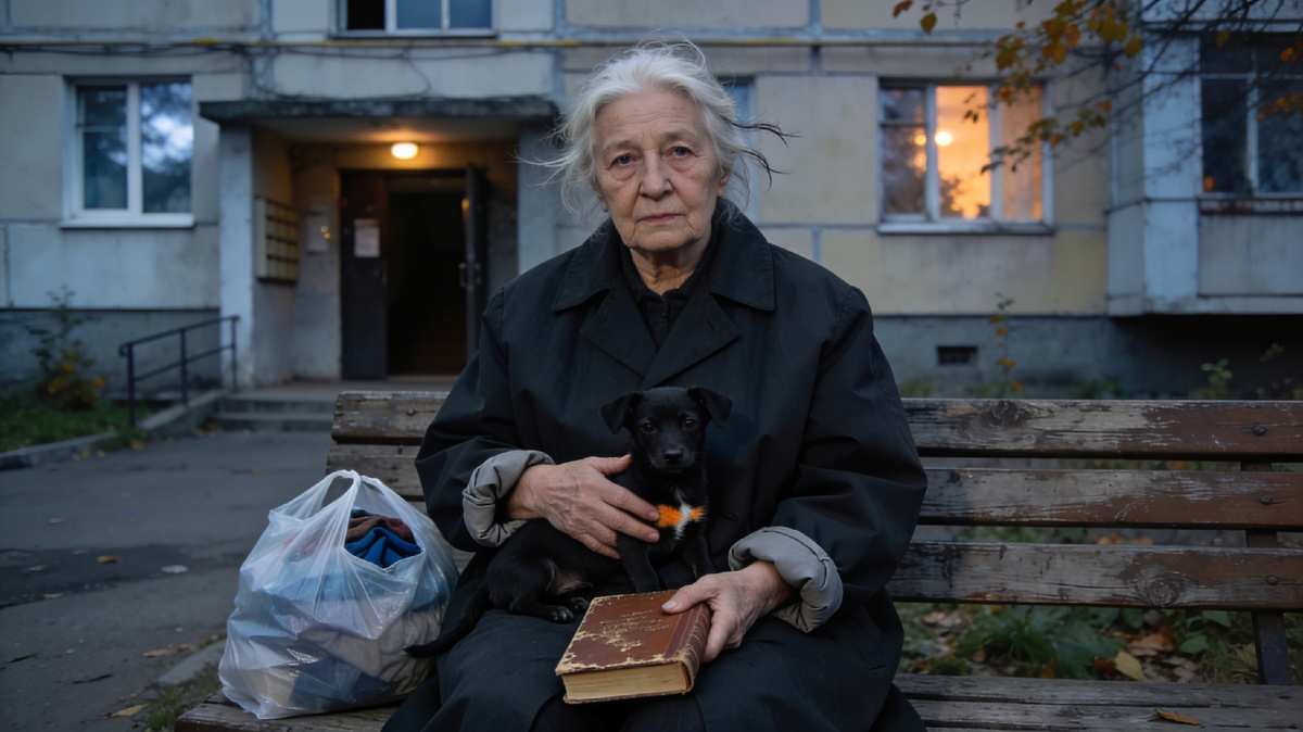 А она сидела на лавке у подъезда. Каждый день. В одном и том же углу, будто ждала кого-то. Немолодая женщина в мужском пальто на три размера больше, рукава подвёрнуты в два оборота. На коленях у неё лежал чёрный щенок – гладкошёрстный, с рыжим пятном на груди размером с пятирублёвую монету.