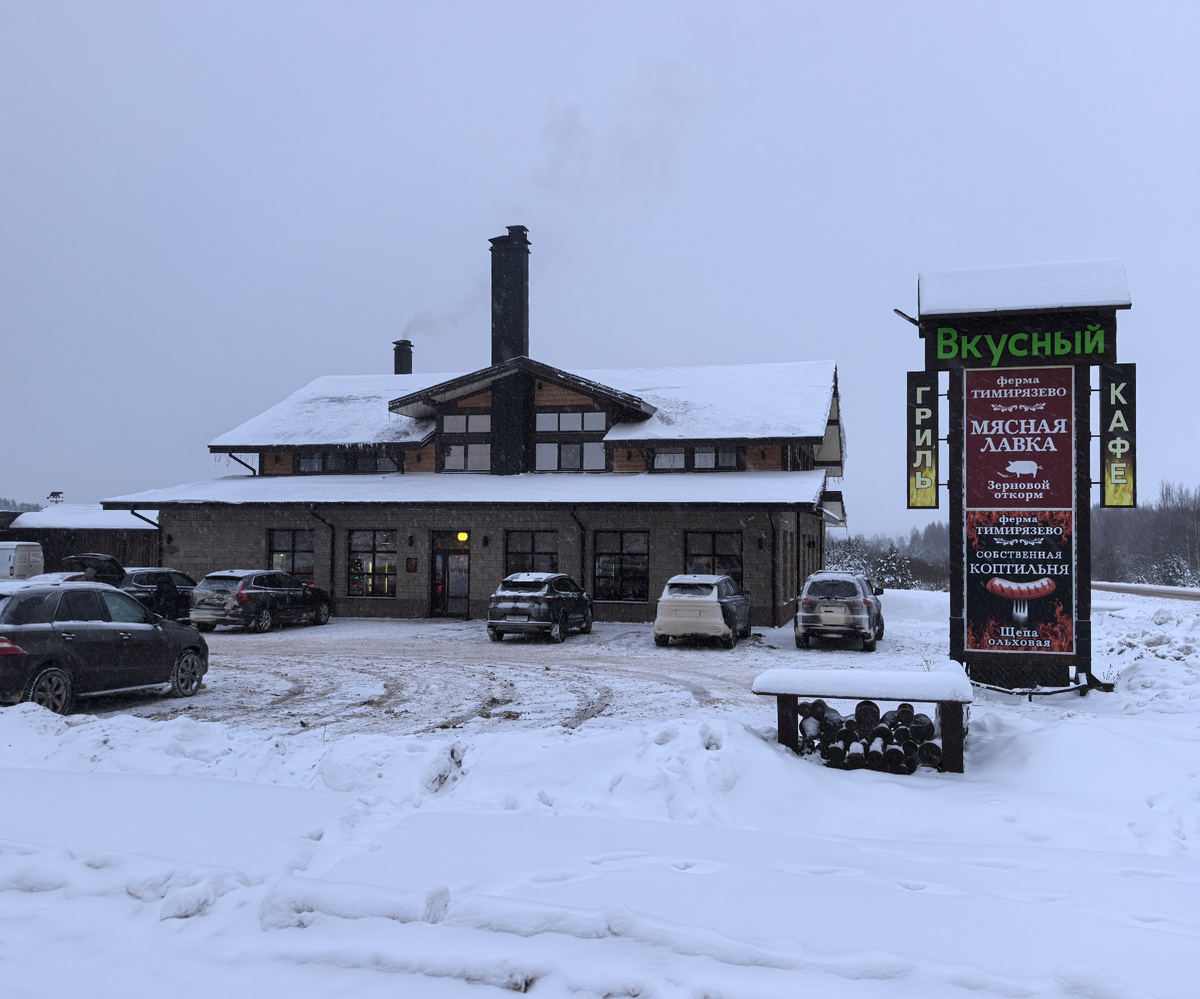 Кафе-магазин «Вкусный» (да это такое название) расположен на трассе 28К-0579, ведущей из Сергиева Посада в сторону Калязина, Кашина и Углича сразу после деревни Луки. Его я заприметил ещё три года назад, когда ездил в Углич, но тогда не стал сюда заезжать и проехал мимо.
