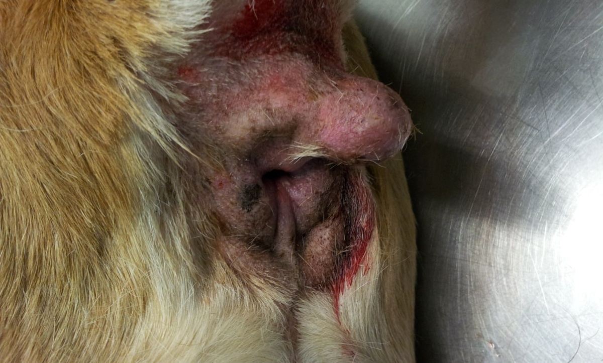 Фото в момент первого визита и через 12 суток после операции. Опухоль доброкачественная, удалена хирургическим путем. На месте операционного шва - незначительное расхождение кожи. Прогноз благоприятный.