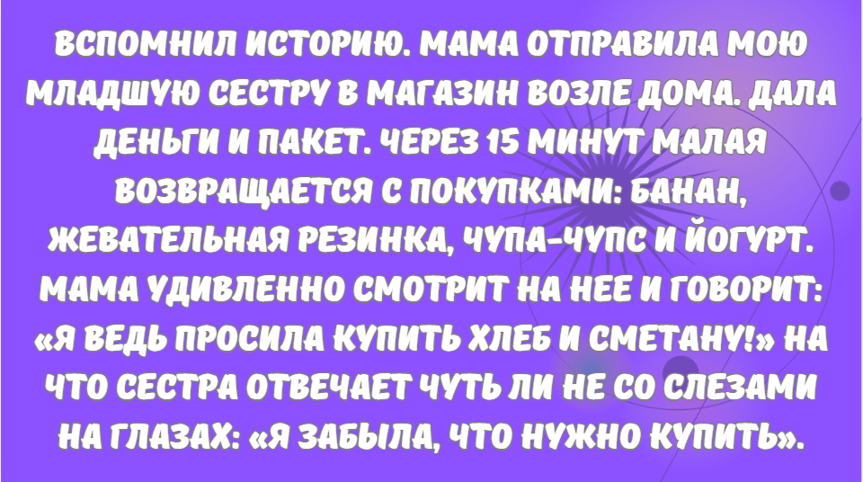 - Вспомнил историю. Мама отправила мою младшую сестру в магазин возле дома. Дала деньги и пакет. Через 15 минут малая возвращается с покупками: банан, жевательная резинка, чупа-чупс и йогурт. Мама удивленно смотрит на нее и говорит: «Я ведь просила купить хлеб и сметану!» На что сестра отвечает чуть ли не со слезами на глазах: «Я забыла, что нужно купить». © Nepret