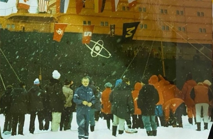Казалось бы, самая обычная фотография, сделанная рядом с судном. Однако вдоль борта на чёрном фоне отчётливо видно белое изображение, которое ни с чем не перепутаешь. Это символ атомной энергии, используемый в геральдике с 1955 года. Обычно он изображается согласно упрощённому графическому образу модели Бора — Резерфорда: в виде точки, реже — безанта (диска или шара), символизирующего атомное ядро, и окружающих его взаимно перекрещённых замкнутых или переплетённых линий, которые обозначают орбиты электронов. Материал для ВАС – ВИДЕО: ЕДИНСТВЕННАЯ В МИРЕ ПЛАВУЧАЯ АТОМНАЯ ТЕПЛОЭЛЕКТРОСТАНЦИЯ "АКАДЕМИК ЛОМОНОСОВ" – на канале МорфлотСПб в МАХ: https://max.ru/brosur/AZvw98O4e-c Именно такие символы были неотъемлемой частью атомного флота под флагом СССР. В их число входил и «Советский Союз». Он стал четвёртым судном серии «Арктика» и вторым — проекта 10521. Ледокол построили в эпоху перемен на петербургском предприятии (ныне — Балтийский завод ОСК): спущен на воду 31 октября 1986 года, а ч