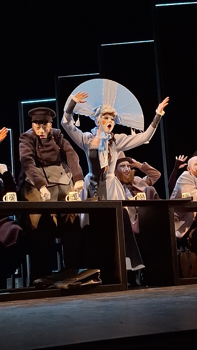 Создатели спектакля - прям команда - огонь, команда мечты! Режиссёр-хореограф — Сергей Землянский, художник-постановщик и художник по костюмам — Максим Обрезков, композитор — Павел Акимкин. Мне кажется, прочитав эти имена, дальше уже не нужно читать, а надо бежать на спектакль! Костюмы какие классные! Грим в стиле комедии масок, но с отсылкой к дымковской игрушке: с красными яблочками на щеках) Очень много есть схожего с фигурками: форма головных уборов, широкие юбки и т.д. Все женихи получились такие разные и по характеру и по костюму. Не очень понимаю как артисты танцуют в этих красивых нарядах да ещё и с накладными деталями на разных частях тела) Некоторые образы весьма значительно украшены этими деталями. Конечно же, самая нарядная и красивая в этом спектакле - это Агафья Тихоновна. Платье небесно-голубого цвета с огромным кокошником, который даже в дверь не пролезает, делает ее такой миловидной и "к поцелуям зовущей"!) Конечно, самым красивым и фееричным стало свадебное платье главной героини. Огромный кокошник, широкая юбка, под которой явно скрывалась какая-то конструкция, раз на нее забирались несостоявшиеся женихи. Создатели спектакля красиво закольцевали фату-занавеску Агафьи Тихоновны: в начале от ее движения просыпается незадачливый Кочкарёв, совершенно не подозревая что ждёт его в самое ближайшее время. А в конце печальная несостоявшаяся невеста уходит в ней в луну, воображая себе того самого идеального жениха ("Если бы губы Никанора Ивановича да приставить к носу Ивана Кузьмича, да взять сколько-нибудь развязности, какая у Балтазара Балтазарыча, да, пожалуй, прибавить к этому еще дородности Ивана Павловича...") и только слышно карканье черных воронов...