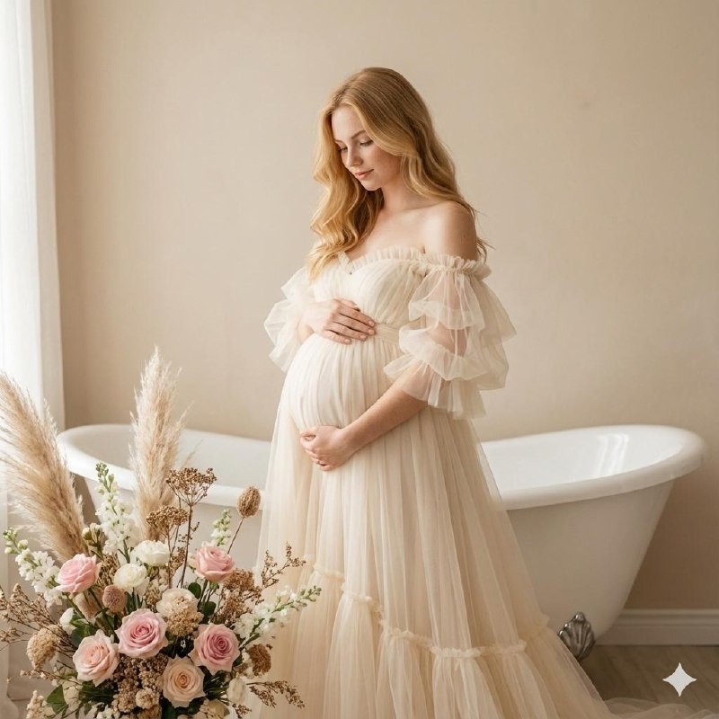 Модель: Nano Banana Сгенерировать🪄 Композиция и настроение Светлая, нежная фотография в стиле романтической фотосессии, посвящённая теме материнства. Общее настроение: гармония, спокойствие, женственность и глубина материнского ожидания. Атмосфера домашнего уюта и единения с природой. Главный объект Беременная женщина в центре композиции, излучающая уверенность и внутреннюю гармонию. Поза: стоит у белоснежной ванны, нежно держит руки на округлом животе. Жест символизирует заботу и трепетное ожидание ребёнка. Внешность модели Длинные светло-русые волосы, уложенные в мягкие естественные волны, обрамляющие лицо. Лёгкий натуральный макияж, подчёркивающий природную красоту. Выражение лица: спокойное, умиротворённое, излучающее внутренний свет. Одежда Воздушное платье кремового оттенка из полупрозрачного тюля. Открытые плечи с нежными оборками. Ткань струится вниз, создавая эффект воздушного облака. Платье подчёркивает лёгкость и изысканность образа. Окружение и фон Светл