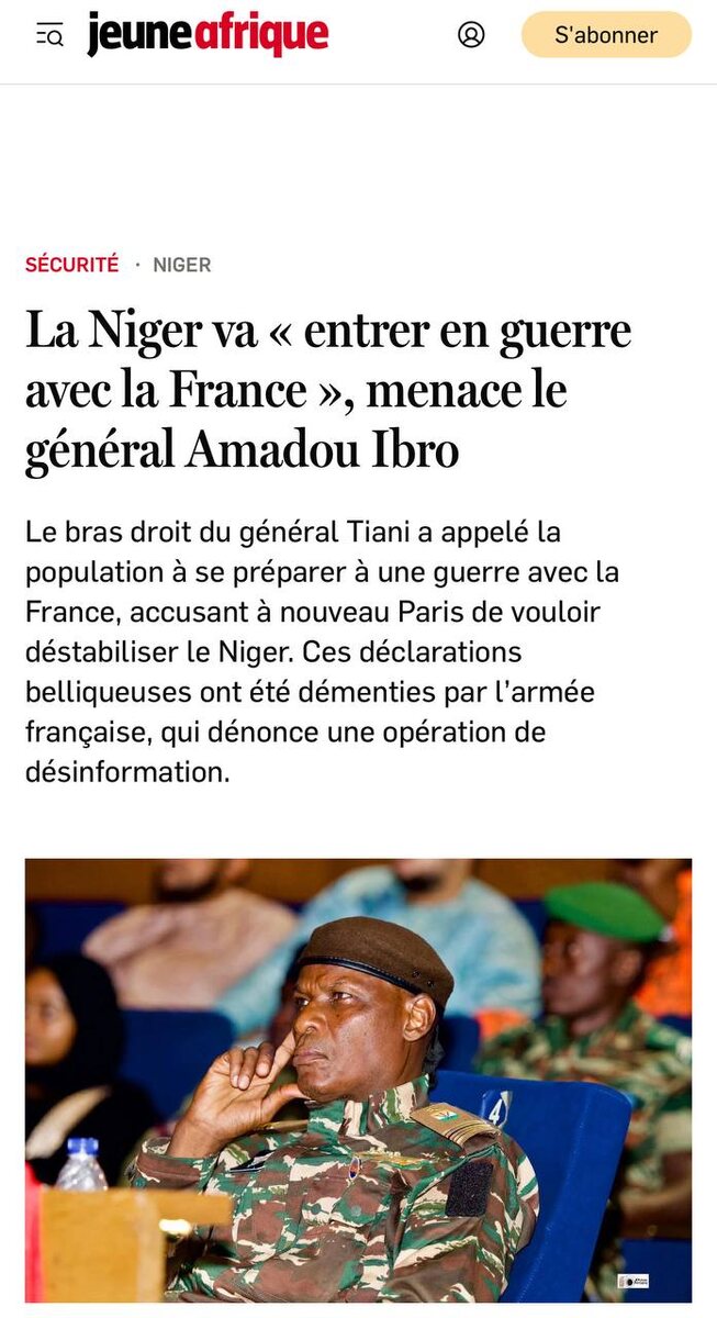 Амаду Ибро, занимающий должность начальника военного штаба президента Нигера Абдурахмана Чиани, заявил, что страна вступает в войну с Францией. Его цитирует издание Jeune Afrique. «Знайте, мы вступаем в войну с Францией, мы не были в состоянии войны, но сейчас мы вступаем в войну с Францией», — сказал Ибро, произнося речь перед молодежью на стадионе Ниамея. По его словам, целью ранее утвержденного указа правительства Нигера о мобилизации являлась подготовка к войне с Францией. При этом официальный представитель Генерального штаба Вооруженных сил Франции полковник Гийом Верне отверг данные заявления. По его словам, которые приводит издание, «о французской интервенции в Нигер не может быть и речи».
