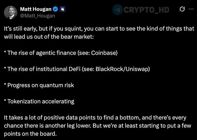 Мэтт Хоуган считает, что криптоиндустрия постепенно накапливает факторы для выхода из медвежьего тренда. Среди ключевых драйверов: ▪Развитие AI-агентов – Coinbase активно движется в этом направлении. ▪Институционализация DeFi – показательно партнерство BlackRock с Uniswap. ▪Прогресс в снижении рисков квантовой угрозы. ▪Ускорение токенизации реальных активов. Говорить о развороте рано – рынок вполне может уйти еще ниже. Но важные точки роста начинают появляться. Для формирования устойчивого дна требуется накопление позитивных сигналов – и этот процесс уже идет. Ранее: - плохие новости уже заложены в цену - давление со стороны продавцов - бычий сигнал Crypto Headlines