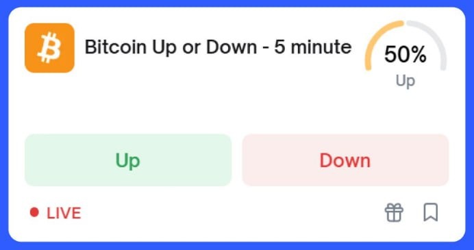 🎲 Специально для лудоманов Polymarket запустил 5-минутные прогнозы на цену BTC, публику уже прогревают кейсами фарма $200 за полчаса.