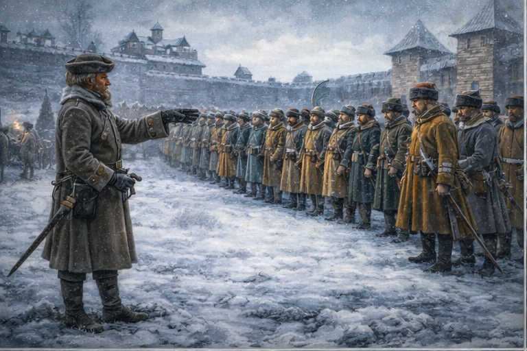 Вступление Полки нового строя не могли появиться сами по себе. Россия XVII века не имела собственной школы линейной пехоты и батальонной тактики. Чтобы создать новую армию, пришлось обратиться к западному военному опыту. Так в русской службе появляются иностранные офицеры — немцы, шотландцы, голландцы. Именно они стали первыми наставниками полков нового строя. Почему приглашали иностранцев В Европе к XVII веку уже сформировалась новая модель ведения войны: • строевая дисциплина, • батальонное построение, • мушкетный залп, • сочетание пики и огня, • развитое осадное дело. Россия же продолжала опираться на конницу и разрозненные стрелецкие части. После Смутного времени стало ясно: без заимствования западного опыта модернизация невозможна. Иностранцы приглашались не только как командиры, но и как инструкторы. Кто служил в русской армии В русской службе в 1630–1650-х годах состояли: • шотландские офицеры, • немецкие полковники, • голландские артиллеристы, • инженеры-фортификаторы.