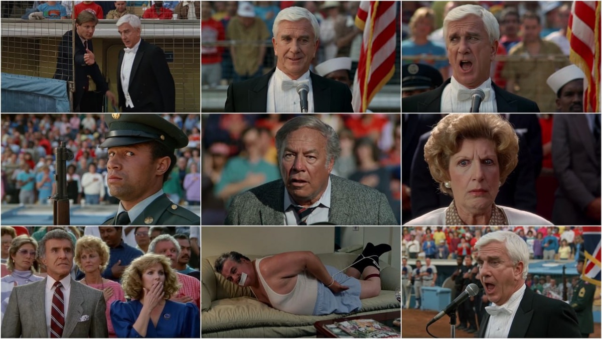 Штатов Америки. [Фрэнк Дребин начинает петь, пока связанный тенор лежит в гримёрке]. Голый пистолет Вчера, к стыду, пропустили столетие Лесли Нильсена, а ведь если смех продлевает жизнь, то мы точно выгадали себе время благодаря старине Фрэнку Дребину. Фрэнк навещает в больнице раненого товарища, Фрэнк знакомится с главным злодеем, Фрэнк защищает королеву, Фрэнк счастливо выбегает за ручку с любимой, посмотрев «Взвод», Фрэнк просто ведёт машину. Здесь множество уморительных сцен, но особняком для нас — исполнение гимна на бейсбольном матче. Был случай в киношколе. Рассказывая о популярном американском кино 80-х, наш лектор добрался до «Голого пистолета» и показал этот фрагмент, заливаясь смехом так, будто сам видел его впервые. Пытался бороться, но тщетно. Это было так неожиданно и так круто, что в едином порыве слегла вся аудитория. Мы и сами помним «Голый пистолет» наизусть, но всё равно продолжаем ржать в голос. Кретински серьёзный персонаж седовласого Лесли Нильсена сам по се