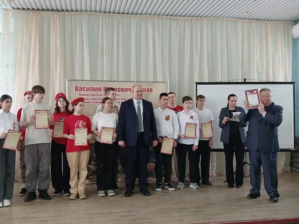 12 февраля в Краснодесантской средней школе имени дважды Героя Советского Союза Маршала Советского Союза В. И. Чуйкова состоялось культурно-образовательное мероприятие «Маршал Победы Василий Чуйков», посвященное 126-летию со дня рождения выдающегося полководца, легендарного командующего, чье имя неразрывно связано с победой в Сталинградской битве и освобождением Европы от фашизма. В ходе мероприятия ребята познакомились с биографией маршала, с его боевыми подвигами, узнали, почему солдаты называли Чуйкова «генерал Штурм», а также о том, что славу одного из лучших военачальников Великой Отечественной войны, Василий Чуйков заслужил во время Сталинградской битвы. В мероприятии принял участие начальник управления образования администрации Неклиновского района, кандидат педагогических наук В.М. Пегушин. Владимир Михайлович поздравил учащихся школы с днем рождения В.И. Чуйкова. Он подчеркнул, что личность Василия Чуйкова является символом патриотизма, мужества и беззаветной преданности Родин