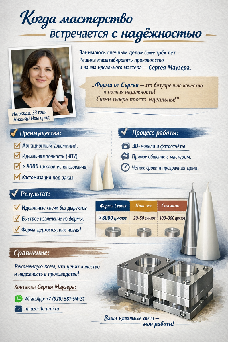 Подведу итог: сотрудничество с Сергеем Маузером превзошло мои ожидания. Получила не просто форму, а инструмент для развития бизнеса. Свечи теперь получаются идеальными, клиенты довольны, а производство стало эффективнее.