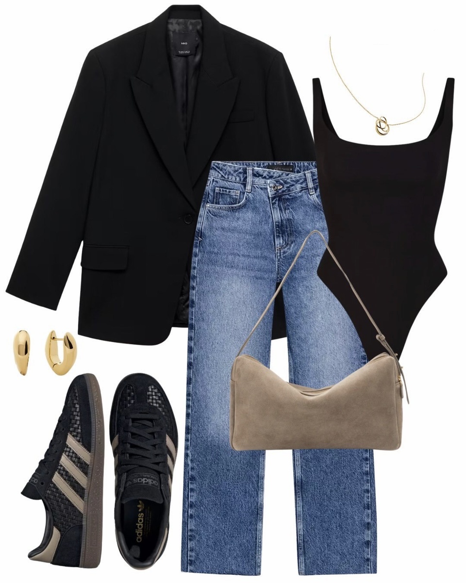 Этот образ — про умный баланс: строгий жакет задаёт характер, деним делает стиль расслабленным, а мягкая бежево-песочная сумка и аккуратные украшения добавляют «дорогую» завершённость. В итоге получается комплект, который можно носить и днём, и вечером, меняя только обувь и настроение.