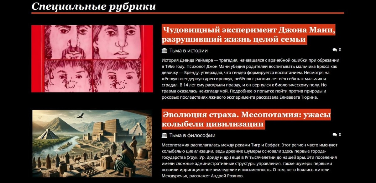 В спецрубриках февральского номера читайте: – О Джоне Мани и его чудовищном гендерном эксперименте, разрушившем жизнь целой семьи. Автор: Елизавета Тюрина; – О страхах жителей Месопотамии в цикле статей Андрея Рожнова «Эволюция страха». Новый номер выходит традиционно в ночь с 19 на 20 число. Ждите! И, кстати, напомним, что наши спонсоры на Бусти могут все это и многое другое прочитать уже сейчас: boosty.to/darker