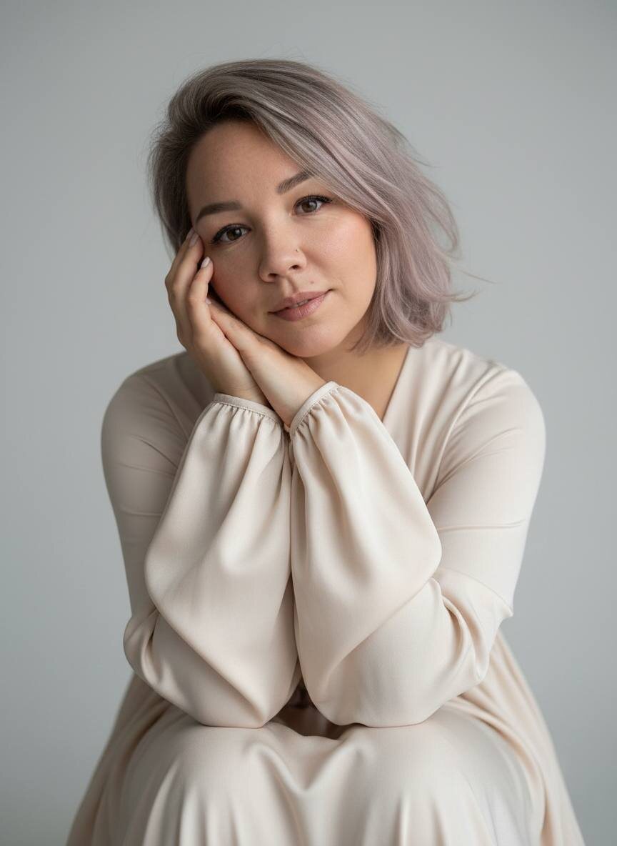 👇🏻 🌟Переходим на удобный сервис для генерации: Ссылка 👉 Syntx Ai Ссылка 👉 Veo3 📌ИНСТРУКЦИЯ ПО ИСПОЛЬЗОВАНИЮ В ЗАКРЕПЛЕННЫХ СООБЩЕНИЯХ ◾️ПРОМТ : Не меняя внешности женщины с фото. В кадре — молодая женщина с волосами цветом как на фото, короткими, но густыми, с объемом у Корней. Она слегка наклонила голову, опираясь щекой и лбом на сложенные руки у лица. Взгляд прямо в объектив, спокойный, задумчивый, с лёгкой улыбкой. На ней пышное платье нежного светлого оттенка, мягкий объёмный силуэт, длинные рукава слегка закрывают кисти. Фон нейтральный, светло-серый. Мягкое рассеянное освещение подчёркивает скулы, губы, создаёт тонкие полутени. Композиция с фокусом на лице и руках, колени видны частично. Атмосфера нежности, гармонии, уюта. Фотореализм, высокая детализация, текстуры, 8K. Цветокоррекция с контрастом прохладного фона и тёплой кожи. Глубокие коричневые и кремовые оттенки. Широкий динамический диапазон, кинематографичный контраст. Полнокадровая камера, 85mm, малая ГРИП,