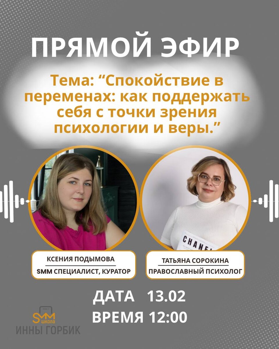 ✨Завтра в 12:00 психолог Татьяна Сорокина и куратор Ксения проведут прямой эфир на тему: «Спокойствие в переменах: как поддержать себя с