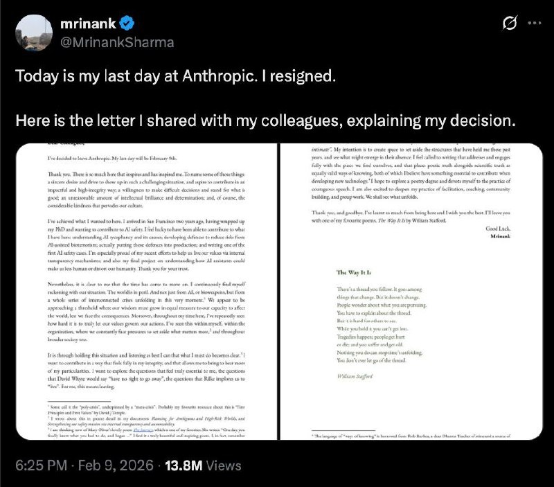 Тем временем глава отдела безопасности ИИ в Anthropic увольняется с письмом о гибели мира