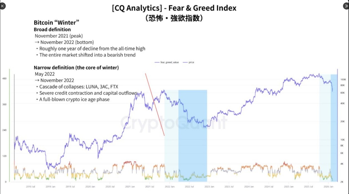 Цена Биткойна упала примерно на 46% с пика в районе $126 000 и сейчас торгуется около $67 900 после пяти месяцев потерь. Индекс страха и жадности находится на отметке 14, что указывает на «экстремальный страх». Чистые реализованные убытки превысили $13 млрд, что сопоставимо с худшими периодами спада 2022 года. 📊 Ключевые моменты: - За 2025 год приток капитала составил более $300 млрд, но общая рыночная стоимость сократилась, что указывает на превышение предложения над спросом. - Четыре последовательных месяца потерь и снижение на 41% за этот период последний раз наблюдались в 2018 году, а не в 2022 году. - Настроения рынка демонстрируют экстремальный страх, что исторически может предшествовать фазе капитуляции. - XWIN Research рекомендует проявлять осторожность, пока притоки капитала не начнут устойчиво увеличивать рыночную капитализацию.