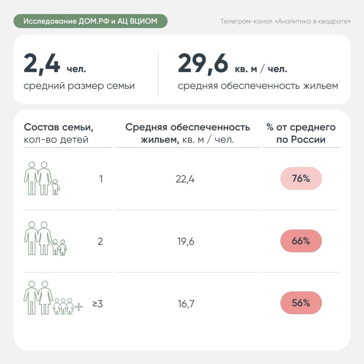 По данным совместного исследования ДОМ.РФ и АЦ ВЦИОМ, показатели по семьям отличаются: 🔵 С одним ребёнком — 22,4 м² на человека; 🔵 С тремя и более детьми — 16,7 м² на человека. 🔵В 2025 году на 59% семей приходилось от 10 до 30 м² на каждого члена семьи. Эксперты отмечают, что стесненные жилищные условия остаются одной из причин, почему семьи откладывают рождение детей.
