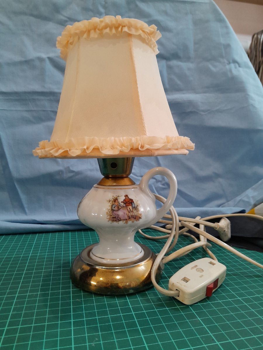 Лампа сразу привлекла моё внимание своим ретро-дизайном. Особенно пленила меня её форма, а именно: декоративная фарфоровая вставка с изящной ручкой, в стиле знаменитого сервиза "Мадонна" ("Пастушка"), который славился своим изысканным оформлением. "Назову её Мадемуазель", - подумала я.