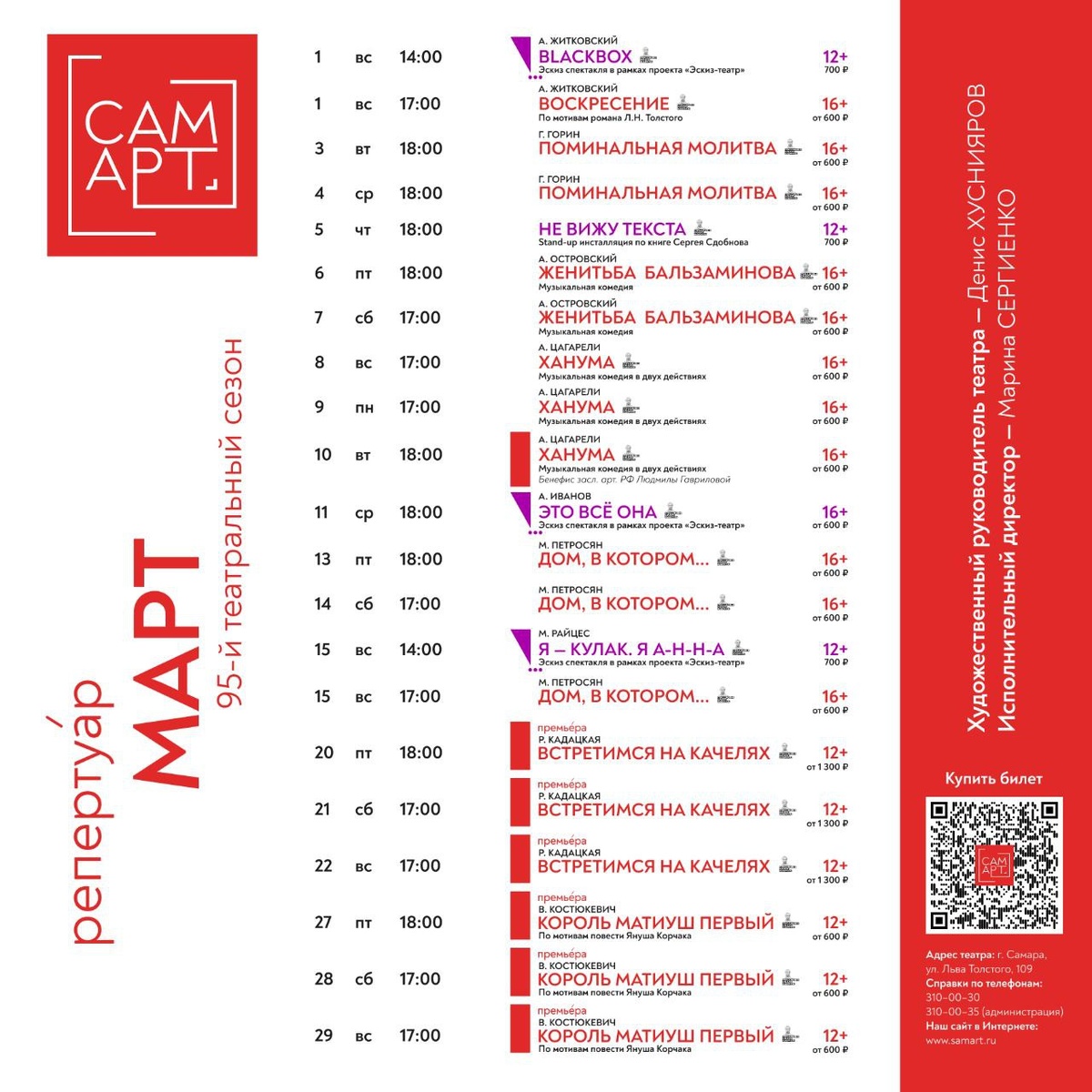 Встречаем весну в СамАрте: ◽️Премьеры «Король Матиуш Первый» (12+) «Встретимся на качелях» (12+): Скоро в продаже ◽️Однозначный must-seen «Возвращение» (16+) «Свет-Луна» (6+) «Воскресение» (16+) «Дом, в котором...» ◽️«Эскиз-театр» «За белым кроликом» (16+) «BLACKBOX» (12+) «Я – КУЛАК. Я А-Н-Н-А» (12+) ◽️️ Экскурсии по театру «Тайны закулисья: от эскиза до спектакля» (6+) «Тайна семи комнат» (12+) Возможна оплата Пушкинской картой Групповой заказ билетов по телефону +7 (846) 310-00-30 или через чат на сайте SamArt.ru До встречи в СамАрте!