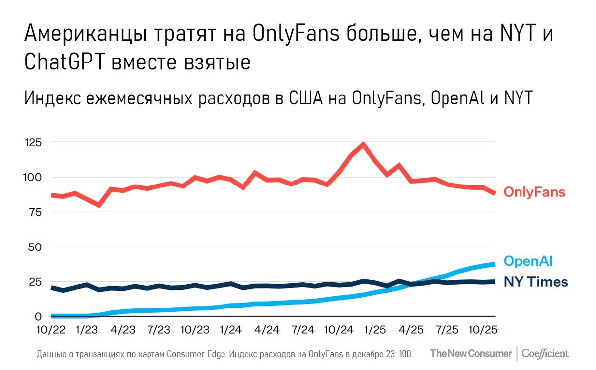 Пока медиа спорят о будущем ИИ и "кризисе журналистики", рынок уже всё решил рублём, то есть долларом. По данным Consumer Trends 2026 (само исследование приложили внизу), американцы тратят на OnlyFans больше, чем на ChatGPT и платные новостные подписки вместе взятые, причём с существенным отрывом. Не твиттерские дискуссии, не морализаторство, а реальные транзакции по картам. С 2016 года платформа выплатила авторам более $25 млрд. Это деньги, которые ушли напрямую "контент‑мейкерам". Модель проста: пользователи платят, 80% получает автор, 20% остаётся платформе. Владелец продает долю В 2025 году владелец сервиса обсуждает продажу компании с оценкой около $8 млрд. При этом через платформу ежегодно проходят миллиарды долларов пользовательских платежей. Казалось бы, актив должен стоить дороже. Но рынок дисконтирует репутационные и регуляторные риски. Деньги любят не только доходность, но и комфорт. Поэтому оценка представляет собой компромисс между сильным кэш‑флоу и "токсичностью" би