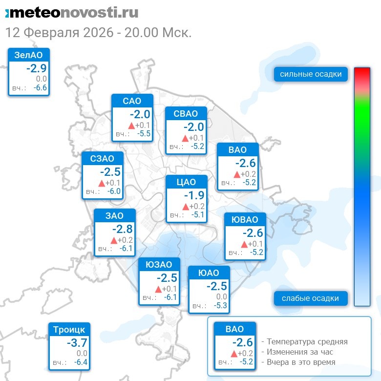В 20:00 в Москве было от -3.6°C до -1.6°C, средняя температура -2.4°C #погода #Москва #зима #температура #12февраля #четверг