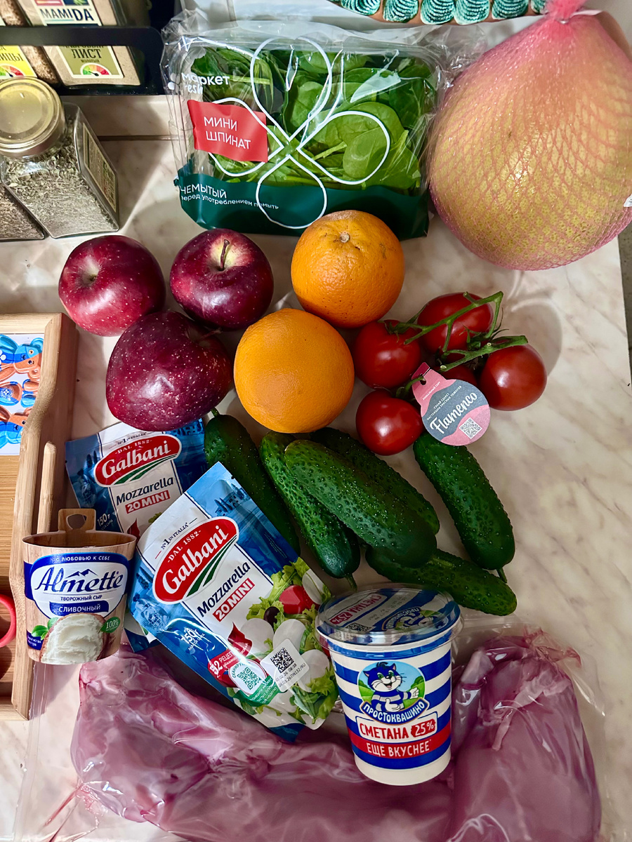 Попугаям взяла яблоки и шпинат. Нам помело и апельсины.