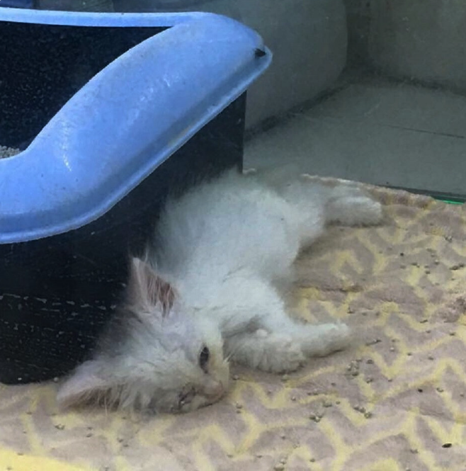 Один глаз полностью заплыл — опухший, красный, закрытый. Шерсть свалялась в колтуны, кое-где вылезала клочьями, обнажая розовую кожу. Малышка лежала, свернувшись в комок, и даже не шевелилась. Только грудка едва заметно поднималась и опускалась.