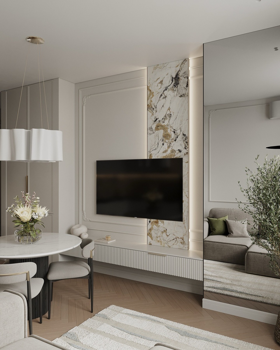 Ошибка большинства проектов: классику доводят до пафоса, минимализм – до холода. Здесь классика дает благородство, минимализм – воздух и порядок. Лепнина есть, но ее ровно столько, чтобы интерьер не стал «богатым» в кавычках. Минимализма много, но он смягчен теплыми текстурами дерева и мрамора.