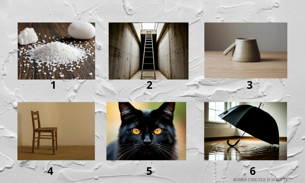 Перед вами 6 предметов. Никакой мистики — просто вещи. Но в пятницу 13-е мозг ищет знаки повсюду. Выберите картинку, которая почему-то притягивает взгляд (или вызывает смутное беспокойство). Или ту, что кажется «странно уютной». Не думайте. Просто выберите. Порядок важен для вас, даже если вы называете себя спонтанным. Рассыпанная соль — символ «нарушенного баланса». Вы боитесь не столько черных кошек или чисел, сколько внезапного хаоса. Пятница 13-е для вас — день, когда мир может дать сбой. Ваша защита — контроль. Вы перепроверяете, закрыли ли дверь, и дважды смотрите на прогноз погоды. И да, вы стучите по дереву. Но тихо, чтобы никто не видел. Лестница — вызов. Пройти под ней нельзя, но очень хочется. Ваше отношение к пятнице 13-го — смесь любопытства и азарта. Вы не верите в проклятия, но проверять их на прочность — ваше хобби. «А что будет, если?» — ваш внутренний девиз. Вы режиссер своего маленького хоррора, и в нем пока всё спокойно. Перевернутая чашка — это остановка. Не доп