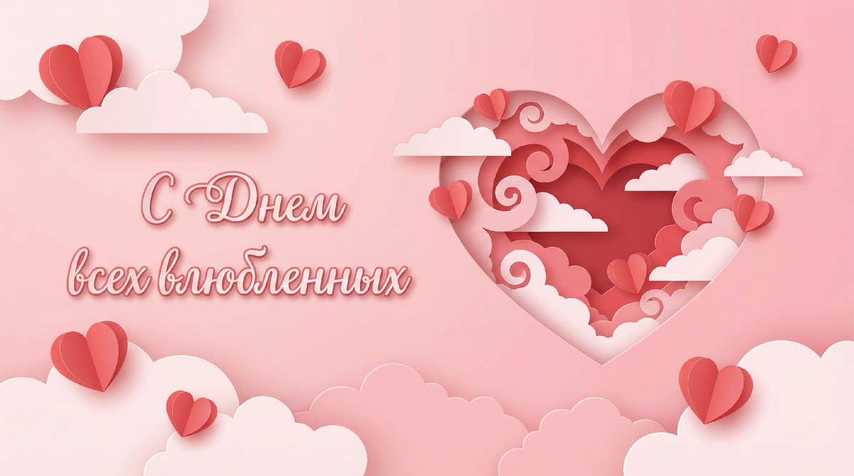 «Valentine's Day greeting card, paper cut style, layered paper art, pastel pink and red colors, 3D effect, soft shadows, hearts and clouds, text "С Днем всех влюбленных", cute, minimal, vector illustration.»