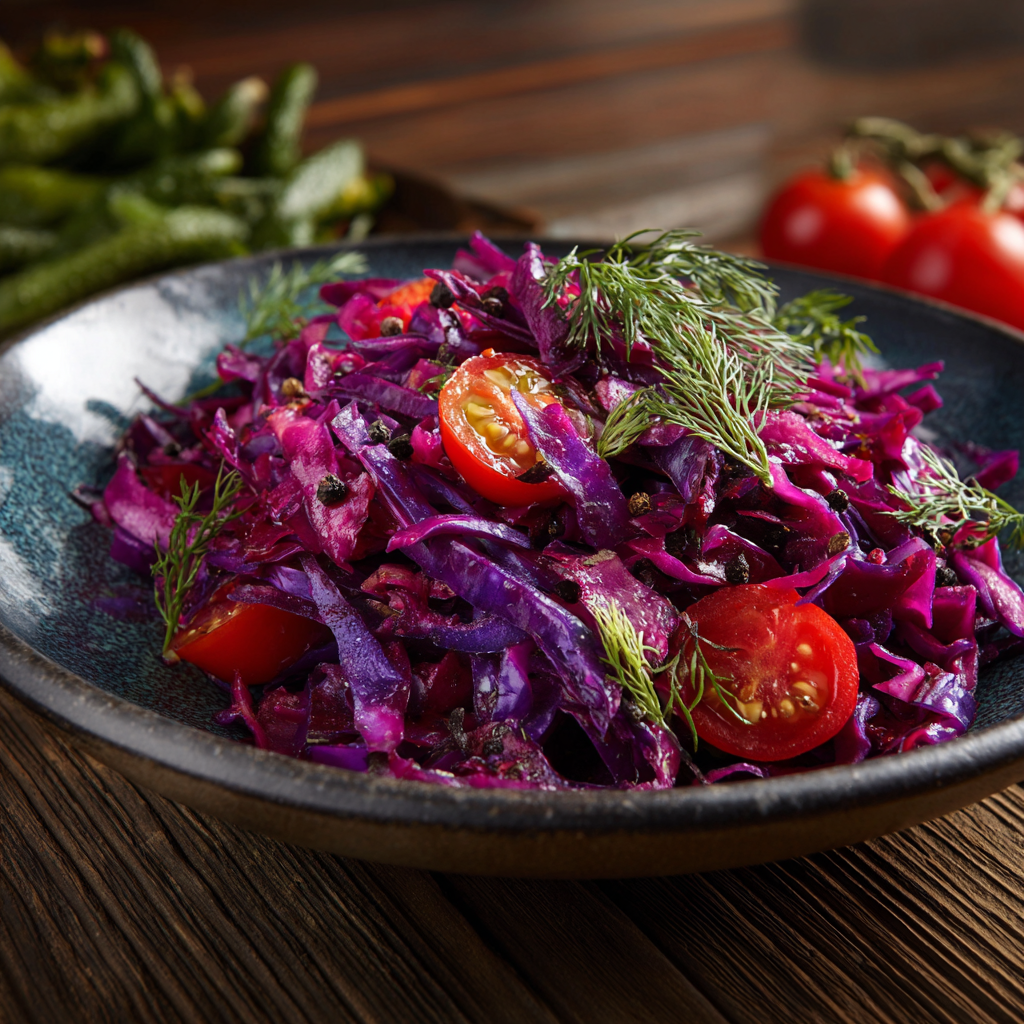 Яркий, хрустящий и очень свежий салат из краснокочанной (фиолетовой) капусты — идеальный вариант для лёгкого ужина, гарнира к основному блюду или полезного перекуса. Благодаря правильной подготовке капусты салат получается сочным, а не жёстким, а уксус или лимонный сок помогают сохранить насыщенный фиолетовый цвет. Ингредиенты (на 2–3 порции) - Капуста краснокочанная (фиолетовая) — 300 г - Помидоры черри — 200 г - Огурцы — 2 шт. - Укроп свежий — 1 пучок - Базилик сухой — 1 ч. л. - Масло подсолнечное рафинированное — 3 ст. л. - Уксус столовый 9% — 1 ст. л. (можно заменить соком лимона или лайма) - Соль — 2 щепотки (или по вкусу) Как сделать фиолетовую капусту мягкой и сочной Фиолетовая капуста красивее белокочанной, но немного жестче. Чтобы салат получился нежным: 1. Удалите несколько верхних листьев. 2. Очень тонко нашинкуйте капусту. 3. Посыпьте её щепоткой соли и хорошо помните руками до появления тёмного сока. Так капуста станет мягкой, сочной и сохранит аппетитный цвет. Пошаговый р