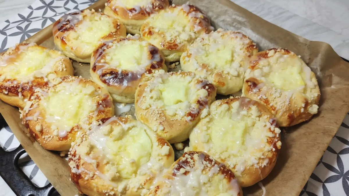 Стакан у меня 250 мл, а указанная порция теста с начинкой рассчитана на 12 штук шикарных сдобных ватрушек. свежие дрожжи 50 гр. молоко 1/4 стакана чайная ложка сахара столовая ложка пшеничной муки пшеничная мука 500 гр. три яичных желтка 100 гр. сливочного масла 100 гр. сахара 1 стакан молока 400 гр. сладкой ванильной творожной массы 25 гр. сливочного масла 25 гр. сахара 50 гр. муки Растереть все в крошку и поставить в холодильник на 30 минут.