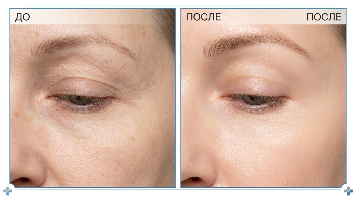 Когда заметила проблему Стою перед зеркалом, наношу тени. И вижу: кожа век какая-то... странная. Не просто с морщинками, а вся в мелких складочках. Как будто кто-то помял бумагу и не разгладил. Попробовала нанести консилер — стало ещё хуже! Он забился в эти складочки и подчеркнул каждую. Загуглила. Оказалось, это называется "креповая текстура" (от слова "креп" — мятая ткань). И это типичная проблема после 45. Почему появляется "креповая" кожа Косметолог объяснила: кожа век в 4 раза тоньше, чем на щеках. Там меньше сальных желёз, меньше коллагена. После 45 липидный барьер истончается → влага испаряется быстрее → кожа обезвоживается. Коллаген распадается быстрее, чем синтезируется → кожа теряет упругость → появляются мелкие складочки. Получается: обезвоженная + без коллагена = "креповая" текстура. Мои неудачные попытки Сначала купила жирный крем для век. Результат — отёки и ещё больше складок. Потом стала наносить гиалуроновую сыворотку. Увлажнение было, но "креп" не уходил. Попробовала