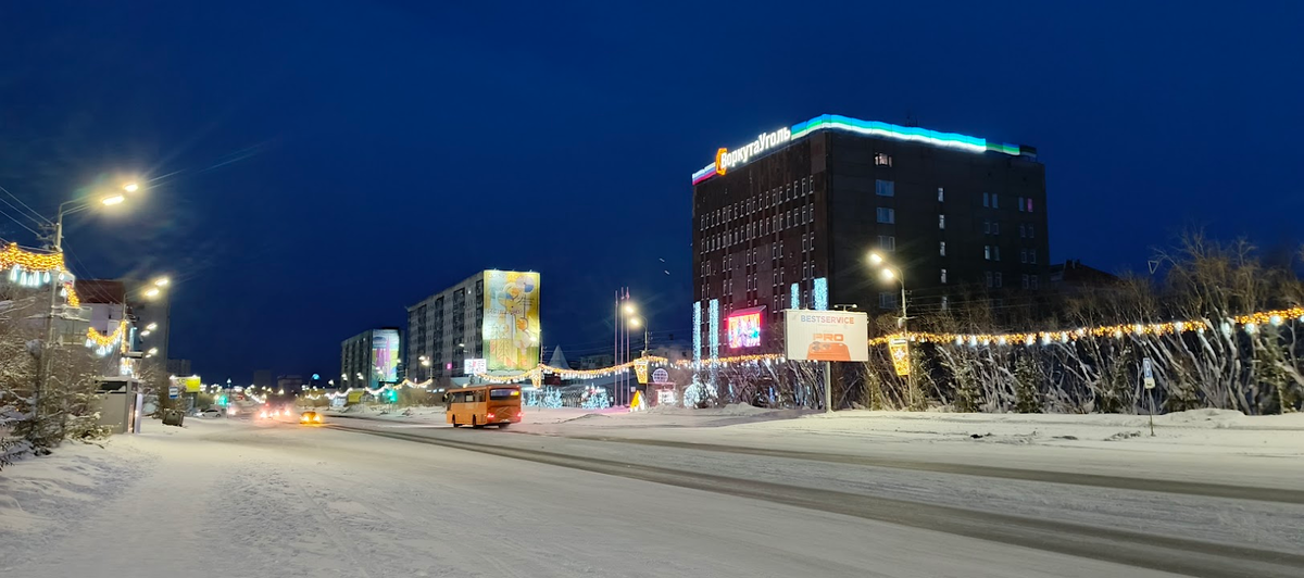 А вот в крупный, по сравнению с остальными, поселок Воргашор решили заехать. Не смотря на то, что с 25 тысяч жителей в 90х сейчас численность населения сократилась до 6 тысяч и меньше, поселок выглядит значительно живее предыдущих. Сюда ходит регулярный автобус из Воркуты, так что если нет возможности арендовать автомобиль то можно добраться на такси или автобусе. Чем и воспользовались двое туристов в ярких зимних нарядах, которых мы первый раз приметили здесь, фотографирующих памятник углю, а на следующий день встретили у моста в поселок Рудник (ударение на первый слог).