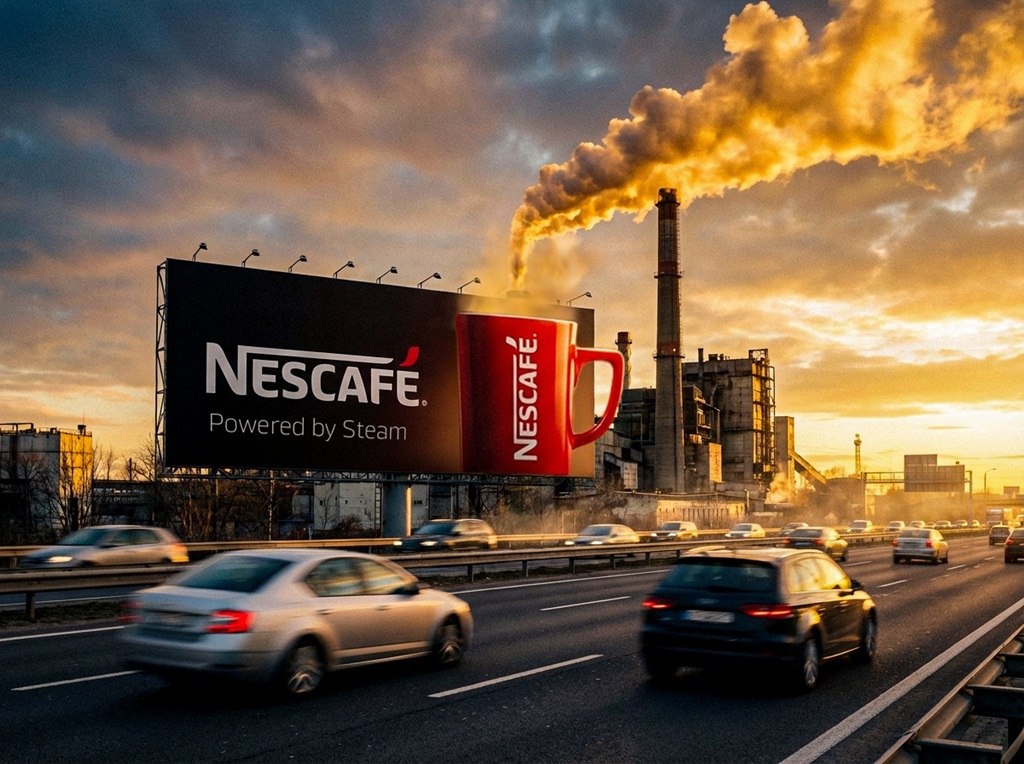 Египетские студенты Helwan University придумали кампанию, в которой выбросы заводов превращаются в ароматный пар над чашкой кофе, а билборды маскируют индустриальные пейзажи. Судя по мокапам, вдохновлялись они видами на МКАД в час пик — та же романтика, только без Nescafe. 📍 Каир — Москва, 2026