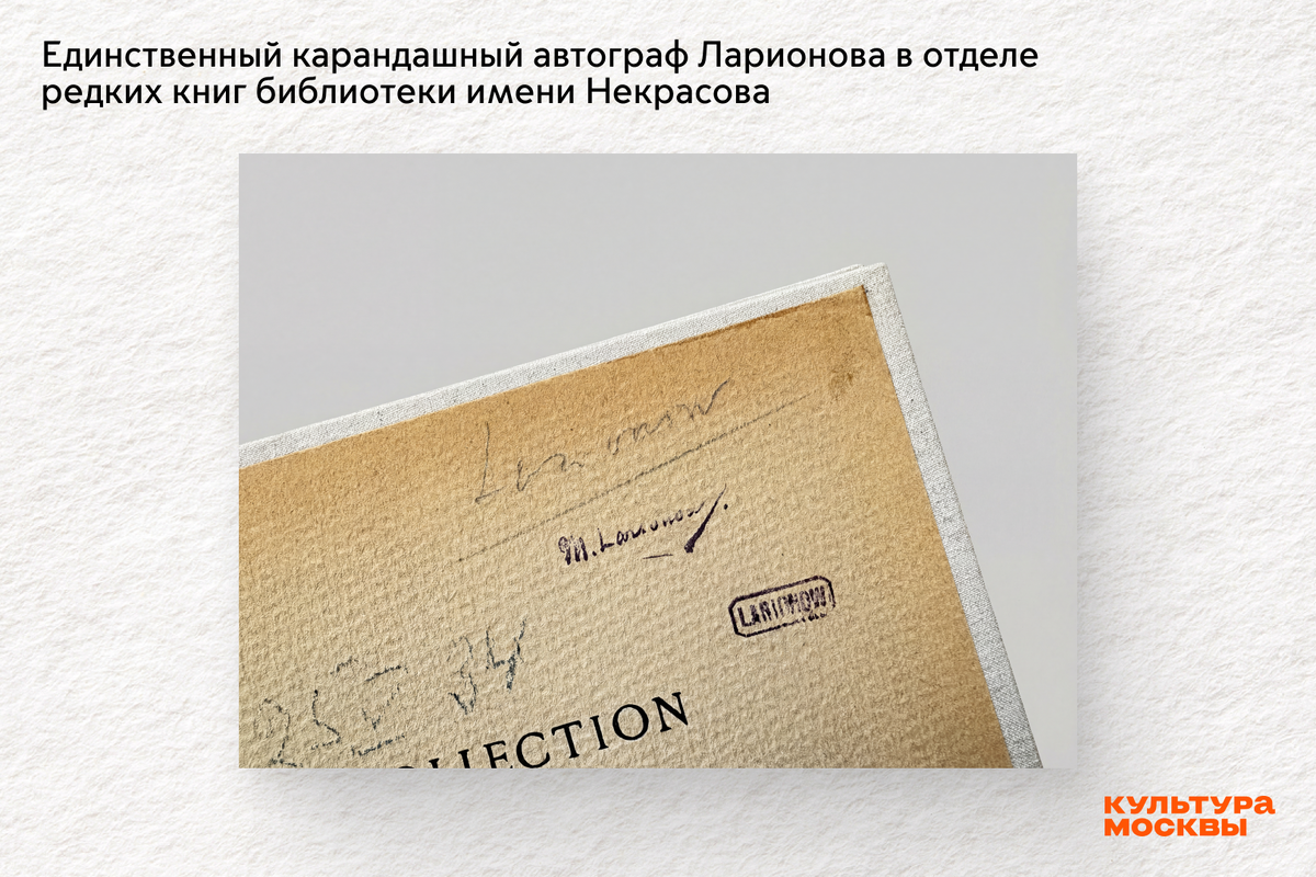 Сотрудники библиотеки нашли две редкие книги 1930-х годов из личной коллекции художника-авангардиста Михаила Ларионова. Оказалось, что общий фонд библиотеки хранил издания, которые можно назвать уникальными раритетами. Главный библиотекарь отдела редких изданий Татьяна Пьянова поделилась с нами подробностями этой находки. Что же обнаружили в библиотеке имени Некрасова? Каталог парижского собрания Анри Галисса (1934) — с карандашным росчерком самого Ларионова на обложке. И каталог выставки скульптора Ирины Кодреану (1937) — с её личной дарственной надписью художнику на французском языке. «Именно эти два издания — свидетельства насыщенной и мирной жизни любителей искусства в 1930-е годы. Можно узнать, что собирали коллекционеры в то время, какие произведения искусства пользовались у них особенным успехом», — объясняет Татьяна Пьянова. Аукционные каталоги тех лет нечасто доходят до наших дней, а эти ещё и хранят уникальные надписи. «Это единственный карандашный автограф Ларионова в отде