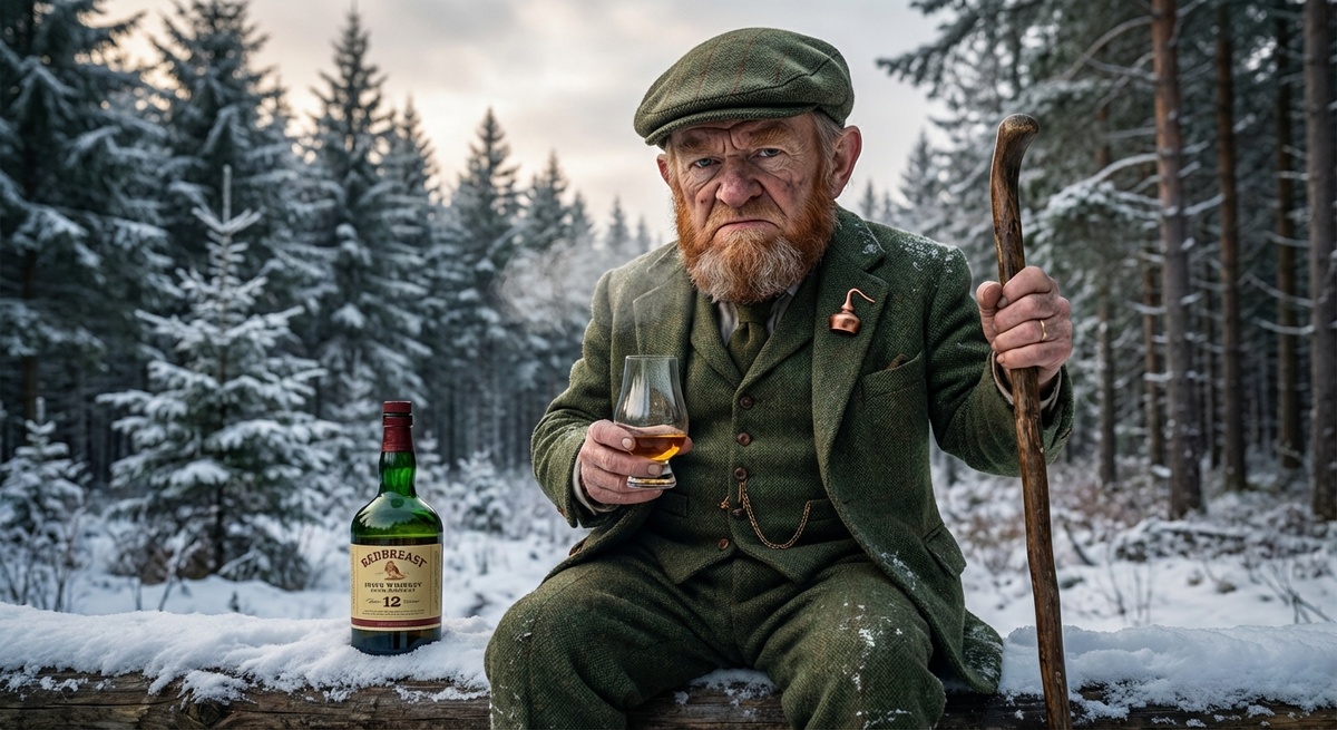 Вышел я тут на природу, чтобы в тишине закрыть очередной "жидкий гештальт". Снег скрипит, мороз щиплет, а в руках - она. Пузатая, зеленая, с малиновкой на груди. Redbreast 12. Только я собрался плеснуть золото в бокал, как из-за ближайшей заснеженной ели донеслось недовольное кряхтение.