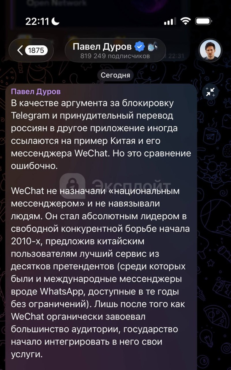 Павел Дуров заявил, что сравнение российского мессенджера Max с китайским WeChat некорректно. По его словам, WeChat стал успешным благодаря честной конкуренции, а государственные сервисы были интегрированы позже и без ограничений. — «Попытка директивно навязывать сервисы населению не увенчалась успехом нигде в мире. Лидеры на своих рынках добились успеха через рынок, а не через правительственные назначения», — подчеркнул Дуров. https://dzen.ru/id/5c0e38ff46ef5c00aaa80527
