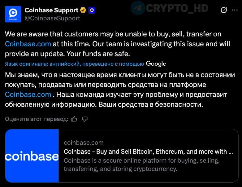 ❌ Сбой на бирже Coinbase – у некоторых пользователей могут наблюдаться проблемы с покупкой/продажей активов и отправкой транзакций.