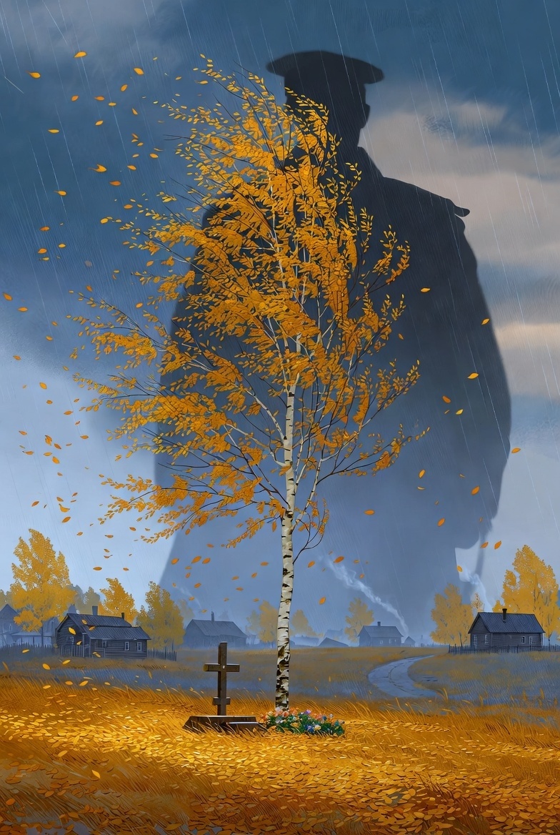 Промт: одна берёза посреди осеннего ветра и дождя, жёлтые листья летят как воспоминания, под берёзой едва видная могила с простым крестом, за ней — тень солдата в шинели 1940-х, дальше — русская деревня, серое низкое небо