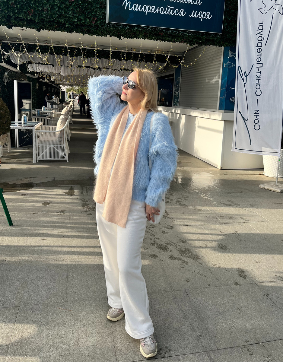 Я очень люблю голубой цвет и считаю, что он мне идёт, поэтому я не смогла пройти мимо этого тренда и составила образ, где голубой рифмуется с главным цветом 2026 года Cloud Dancer. Этот дуэт позволяет создать нежные, воздушные и в то же время выразительные аутфиты.