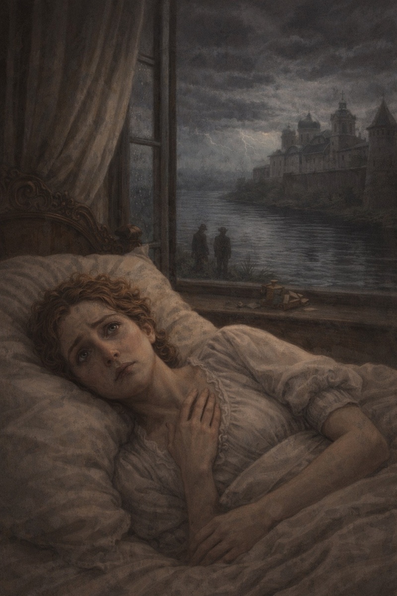 Машенька проснулась рано, ещё до свету, и долго лежала с открытыми глазами, глядя в потолок. В груди у неё, там, где вчера вечером разливалось такое ясное, такое полное счастье, теперь поселилась глухая, ноющая боль. Она вспоминала каждое мгновение вчерашней встречи: как он вошёл в собор, как стоял в тени, как взял её руку на паперти. Она слышала его голос — глухой, срывающийся, почти беззвучный. Она видела его глаза — в них было столько боли, столько любви и столько отчаяния, что у неё самой сердце разрывалось на части.