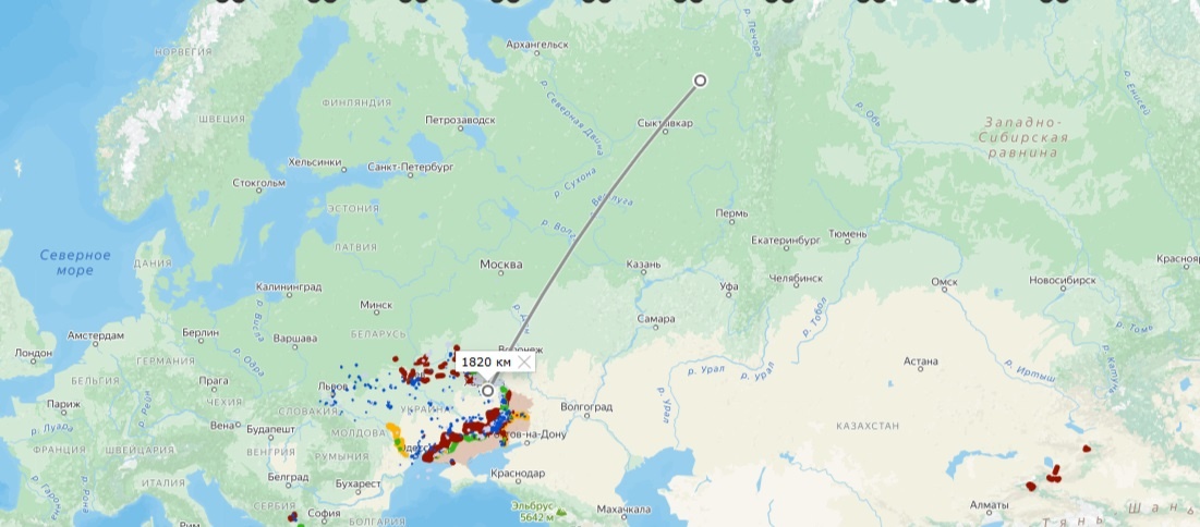 После нескольких относительно спокойных месяцев сегодня вновь проиозшло громкое событие - беспилотники прилетели на НПЗ в Ухту. Возможно, что не каждый читатель представляет где она и как далеко находится от линии соприкосновения. Показываем: 1800 километров по самым скромным подсчётам. Маршрут по прямой рядом с Московским регионом, который само собой прикрыт на 5+. Но трасса могла пройти прямо рядом с ним. Мы выяснили, что во Владимирской области была угроза БПЛА (хотя говорят, что там едва ли не каждую ночь приходят такие СМС от МЧС) в период с 1:30 до 7:00, а маршрут как раз мог быть таким: Местность тут довольно населённая, много различных предприятий и объектов связанных с оборонкой, поэтому можно предположить (хотя это и не стопроцентно), что эти беспилотники могли лететь другим маршрутом (более простым и безопасным для них), частью которого они уже летали несколько раз: А тут расстояние уже будет за 2000 километров. Знаем, опять будут предположения, что запустили из Прибалтики: