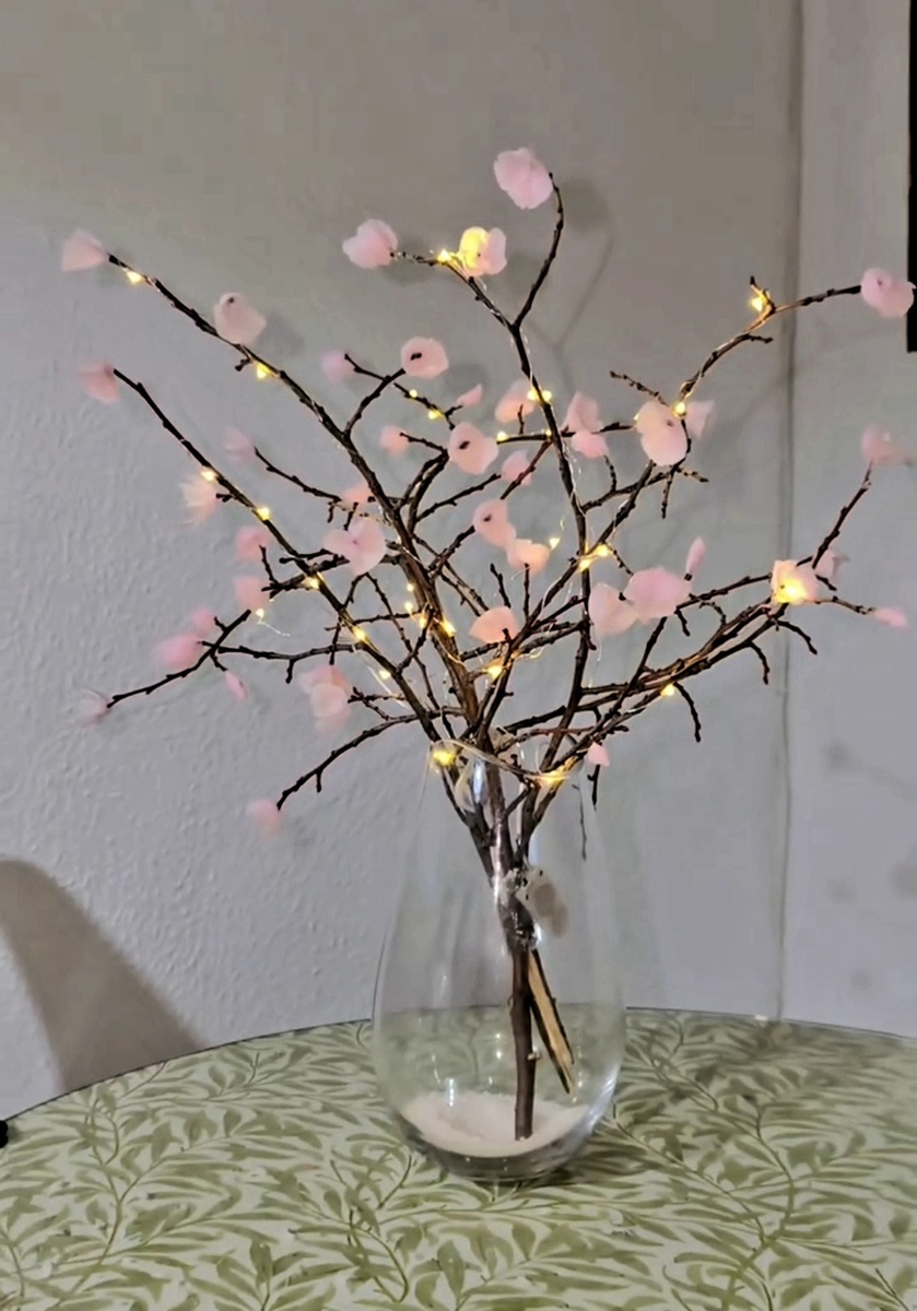 Главный секрет таких деревьев — цветы из парафина. Они не вянут, не осыпаются, не боятся перепадов температур. Выглядят как живые, а делаются за один вечер. Достаточно ветки, свечного парафина (можно переплавить старые свечи) и фена, чтобы при необходимости что-то подправить или «подправить». Более подробно об это я писала тут: