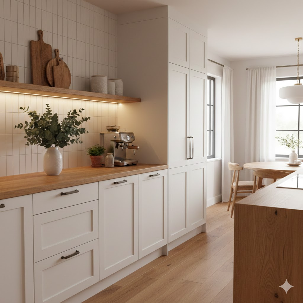 Самый популярный и безотказный прием — внедрение древесных текстур. Белый гарнитур на кухне может выглядеть холодным, но стоит добавить столешницу из дуба или открытые полки из сосны, как атмосфера мгновенно меняется.