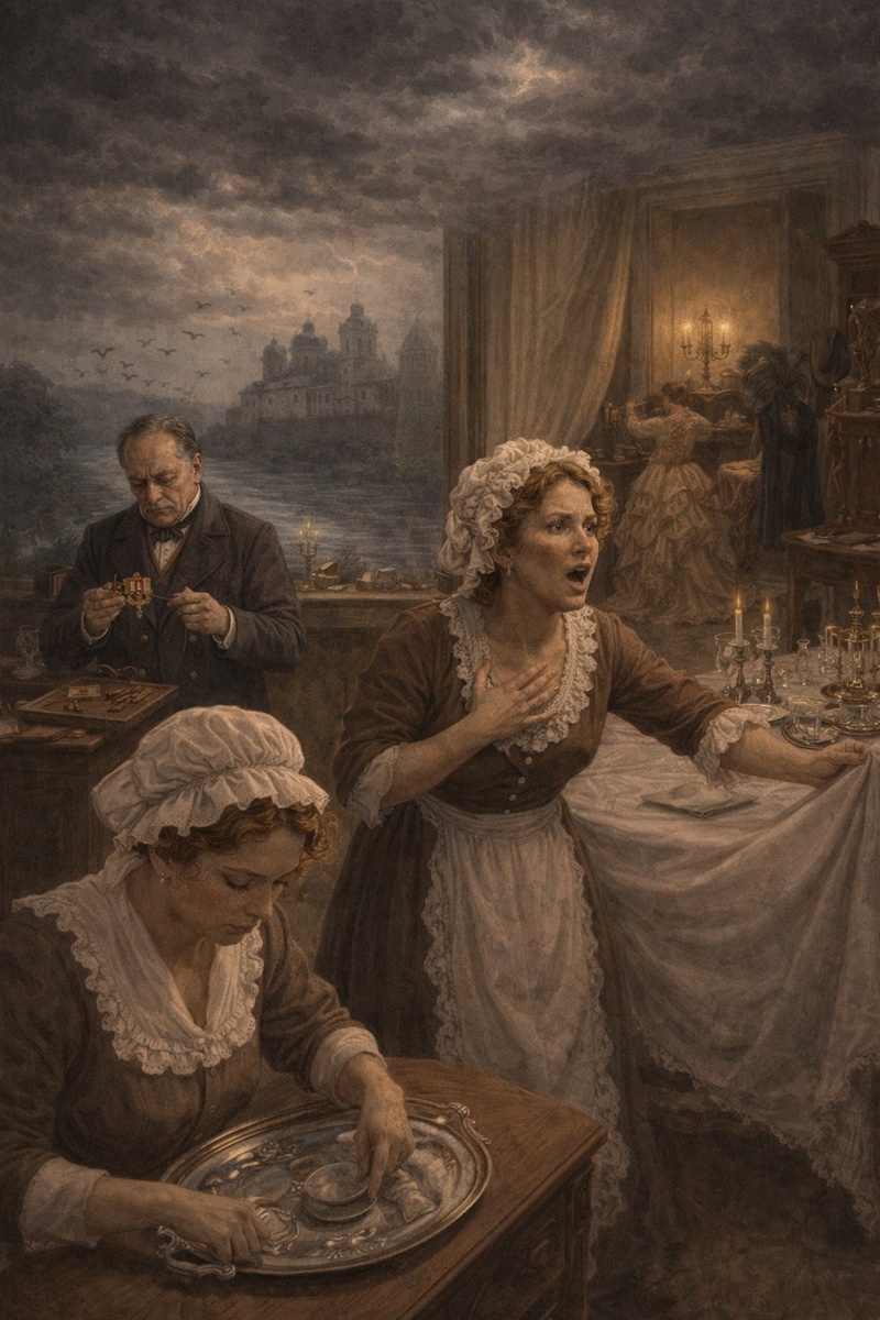 Машенька вошла в залу под руку с отцом — и тотчас почувствовала на себе десятки взглядов. Мужские — оценивающие, прикидывающие, сколько может стоить такой товар на ярмарке невест; женские — завистливые, цепкие, выискивающие изъяны в причёске, в платье, в брошке; и над всеми этими взглядами, тяжёлыми, липкими, как паутина, — взгляд Николая Пантелеевича, который стоял у колонны, мял в руках носовой платок и смотрел на Машеньку с таким выражением, точно перед ним не живая девушка, а долгожданный, наконец-то полученный товар.