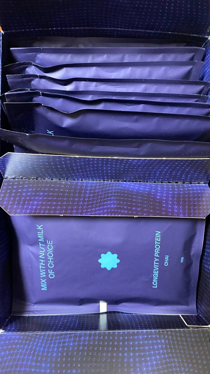 , командировки и на каждый день, когда не хочется возиться с банками и дозировками. Что внутри (по фото) • Essential Supplements — ежедневные пакеты с капсулами/таблетками • Longevity Mix (Blood Orange) — порошковый напиток в саше На саше: 14.6 g. • Longevity Protein (Chai) — протеиновая смесь в саше На саше: 70 g. • Extra Virgin Olive Oil — оливковое масло extra virgin в порционном формате На саше: 15 ml. Почему это удобно • Всё в индивидуальных пакетиках — кинул в сумку и поехал. • Не нужно мерить дозировки: 1 день = 1 набор. • Подходит тем, кто хочет держать рутинy питания/добавок даже в дороге. Цена 29 990Р. Важно: это dietary supplement (БАД), не является лекарством. Если есть беременность/ГВ, заболевания или вы принимаете препараты — лучше согласовать с врачом.
