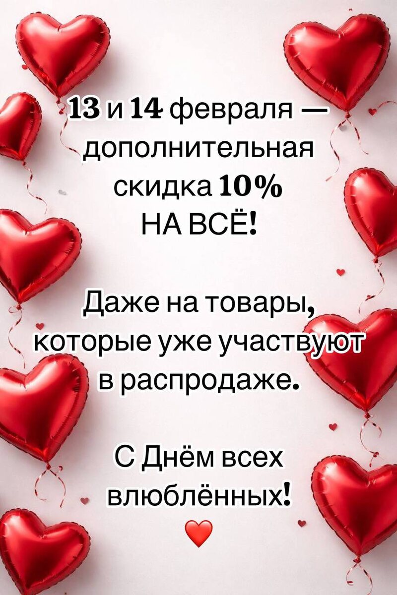 ! 💕 ☄️Дарим настроение и дополнительную скидку 10% на ВЕСЬ АССОРТИМЕНТ (даже на товары со скидкой). ☄️АКЦИЯ ДЕЙСТВУЕТ ТОЛЬКО 13 и 14 ФЕВРАЛЯ! Успейте порадовать себя и близких выгодными покупками!💗
