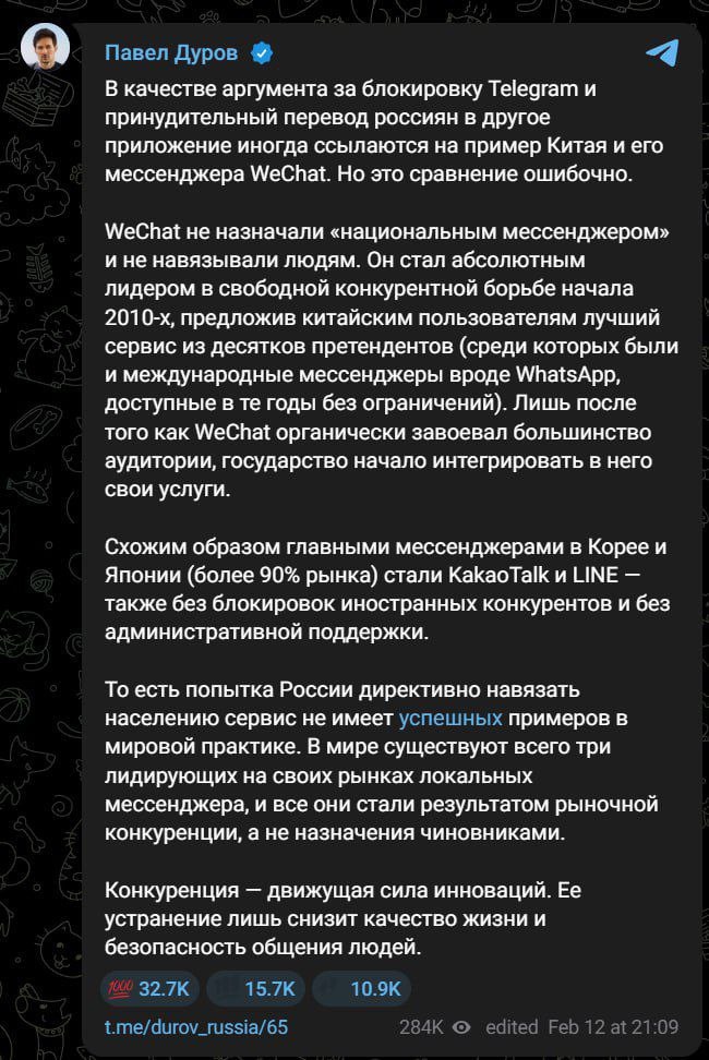 🚫‼️🇷🇺🏴☠Павел Дуров выступил с новым заявлением: директивное навязывание мессенджеров не имеет успешных примеров в мировой практике