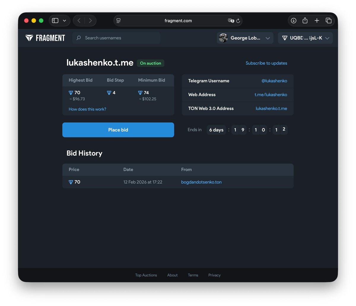 Редакция канала «Лобушкин» обнаружила на платформе Fragment выставленный на продажу юзернейм @lukashenko